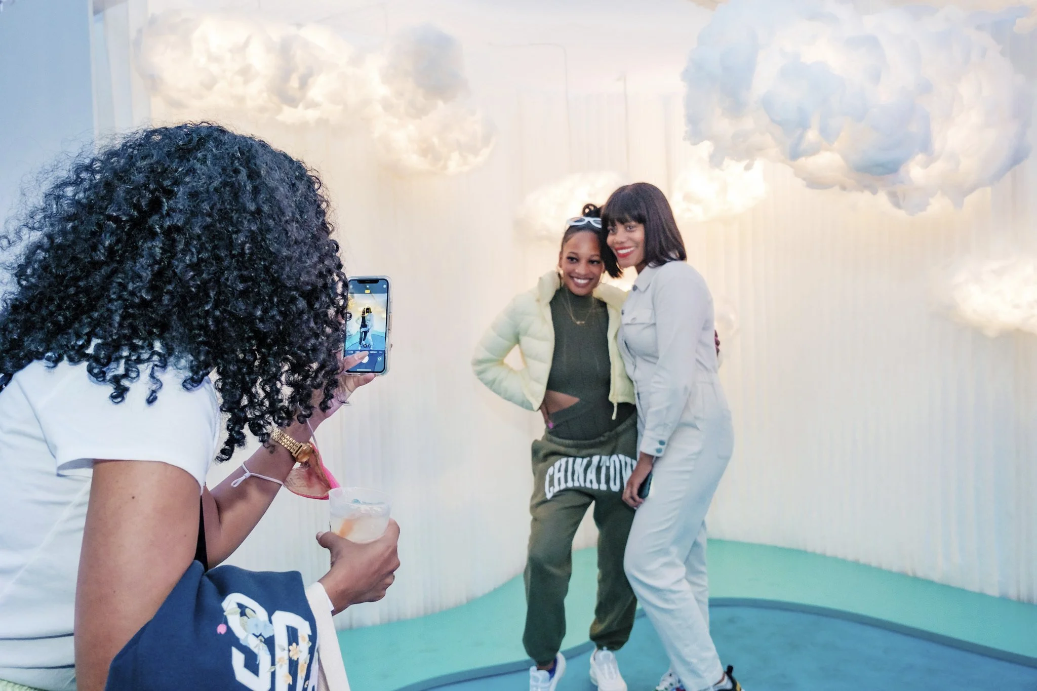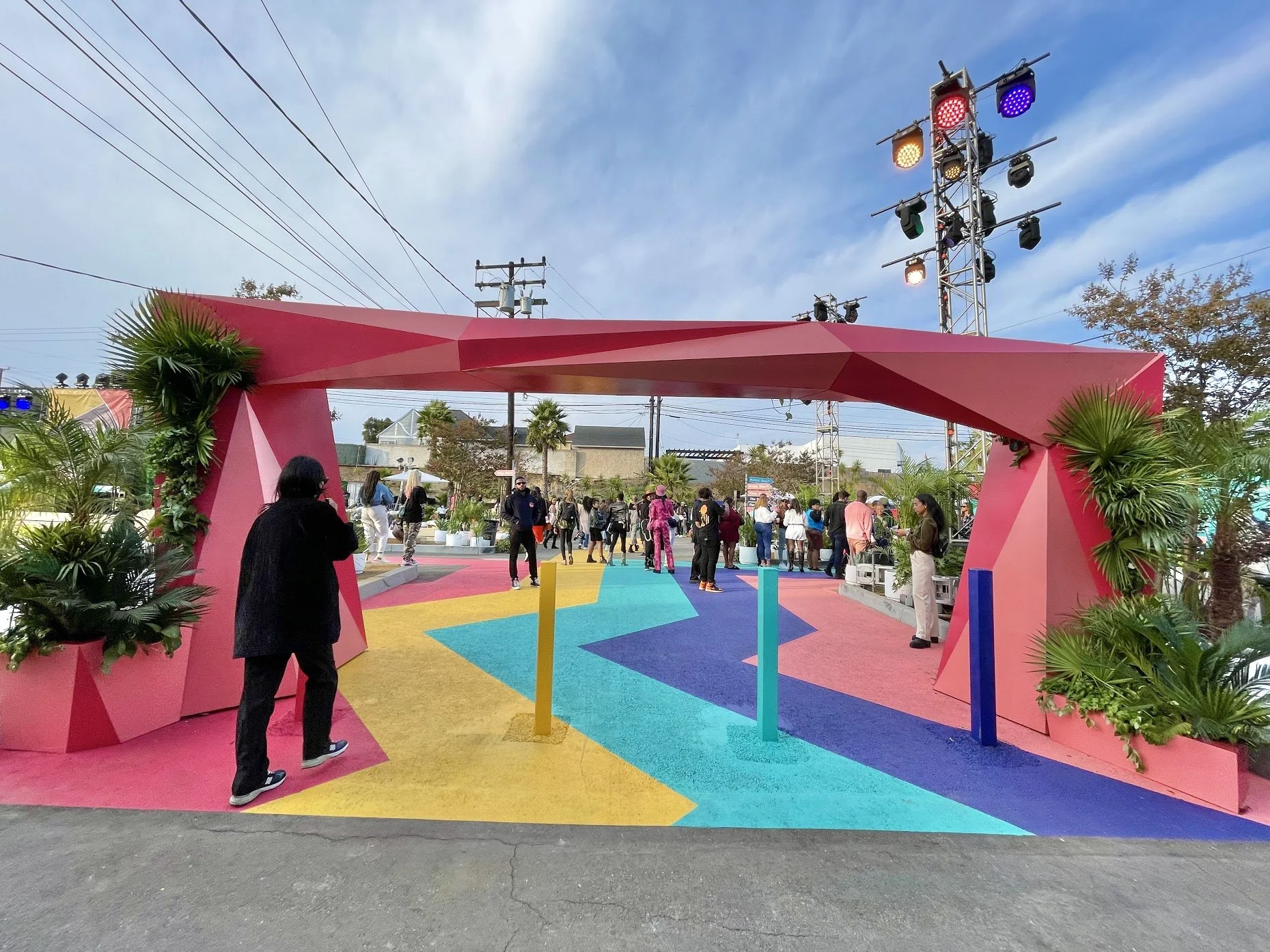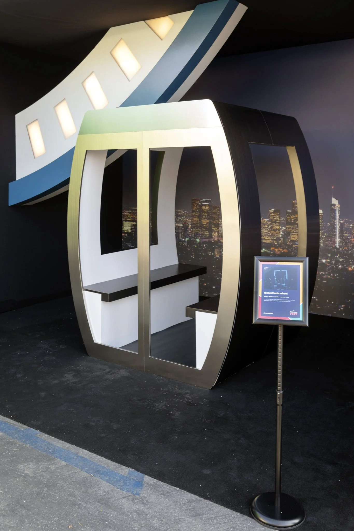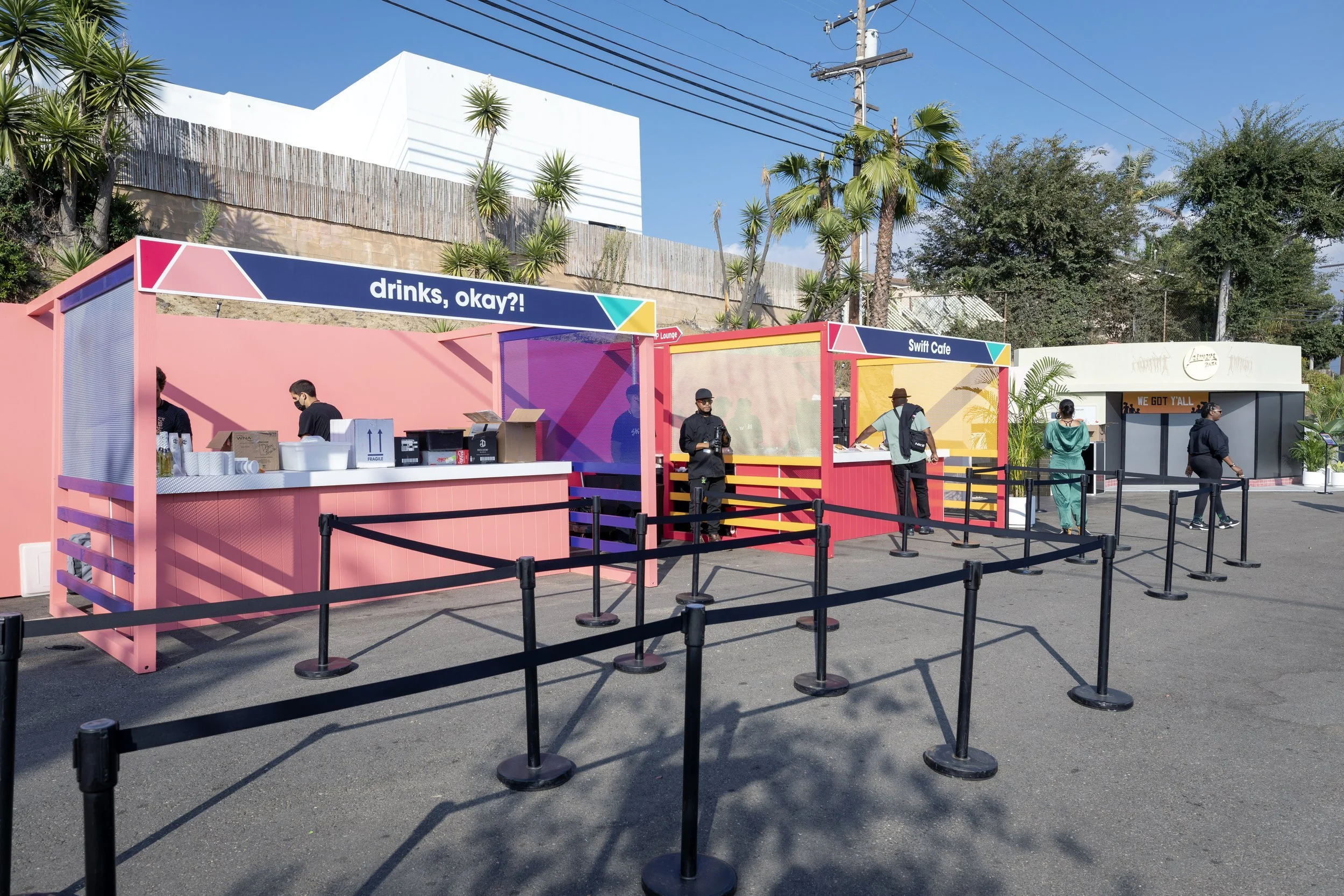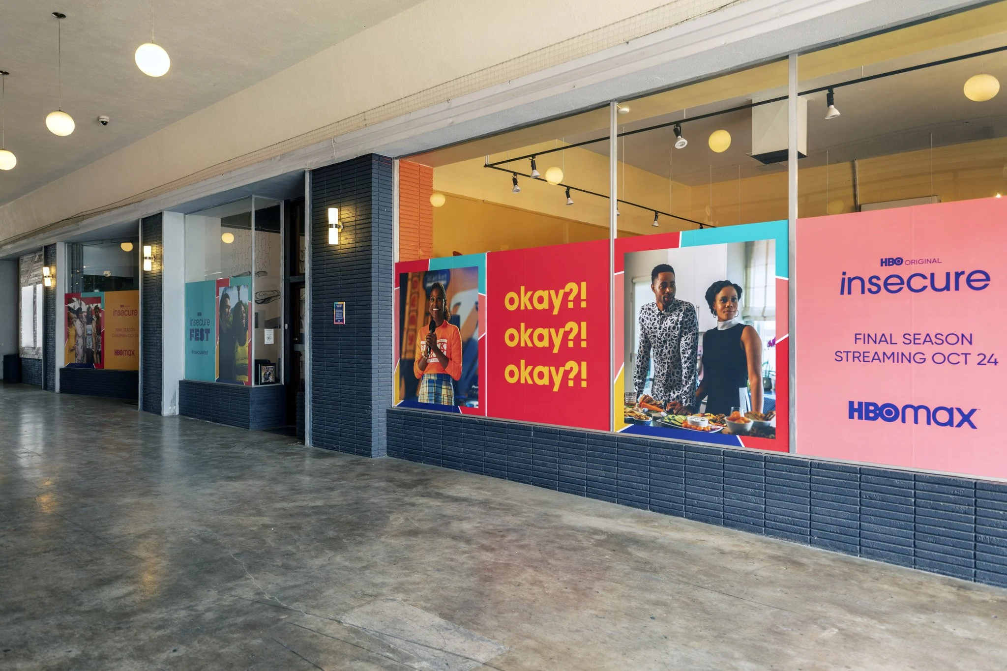 Design Direction: Bold, oversized shapes inspired by the blocks in Issa Rae’s southern Californian neighborhood dominated the graphic language while vignettes mimicked iconic settings from the show. Metal mesh, brightly-colored slats, and palms fit the airy LA aesthetic, and plenty of show references throughout kept the entire space on-theme. Each designated area was labeled with the moniker “…okay?!” to refer to the the way Issa’s character hypes up her best friends in the show.