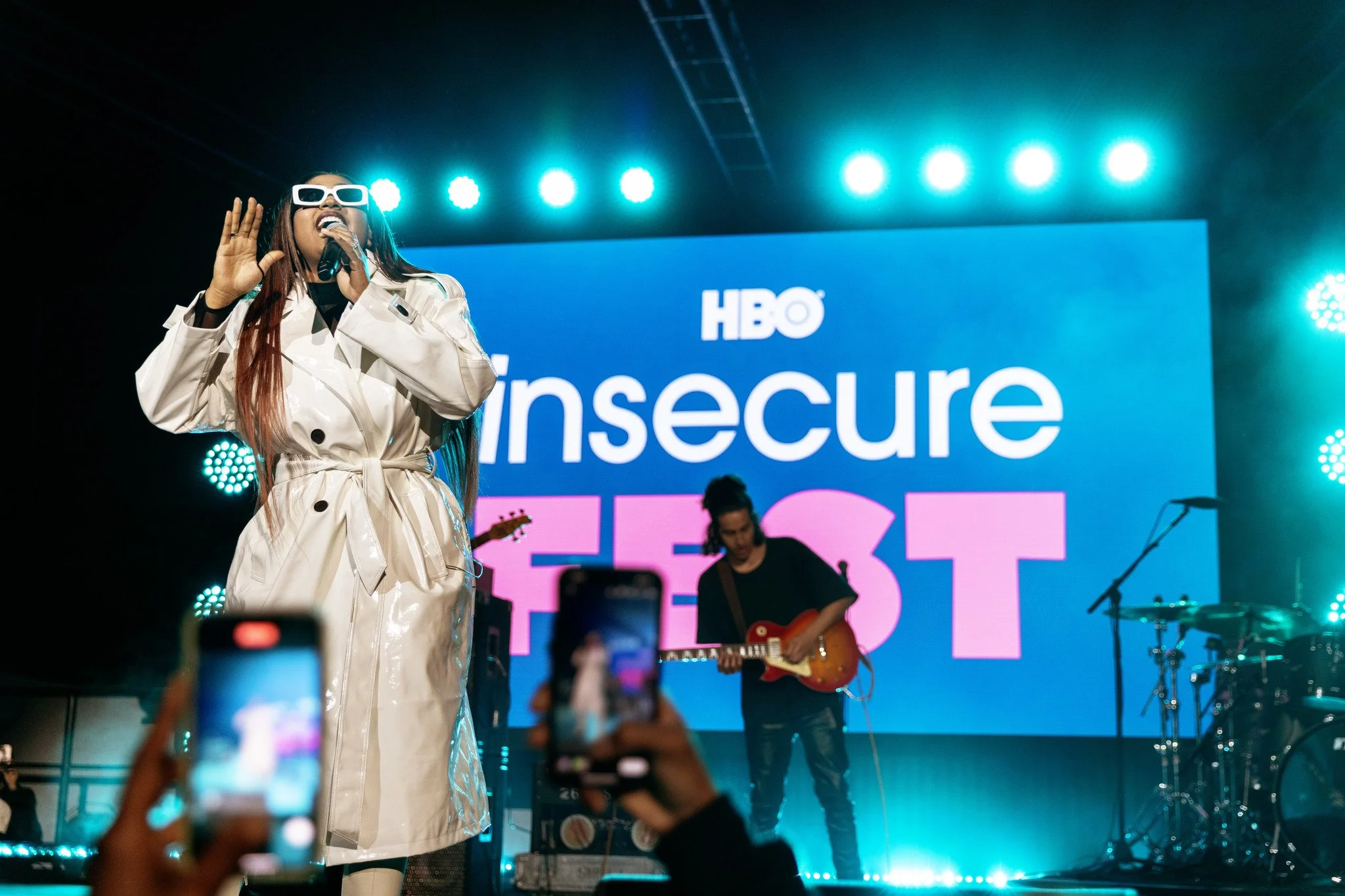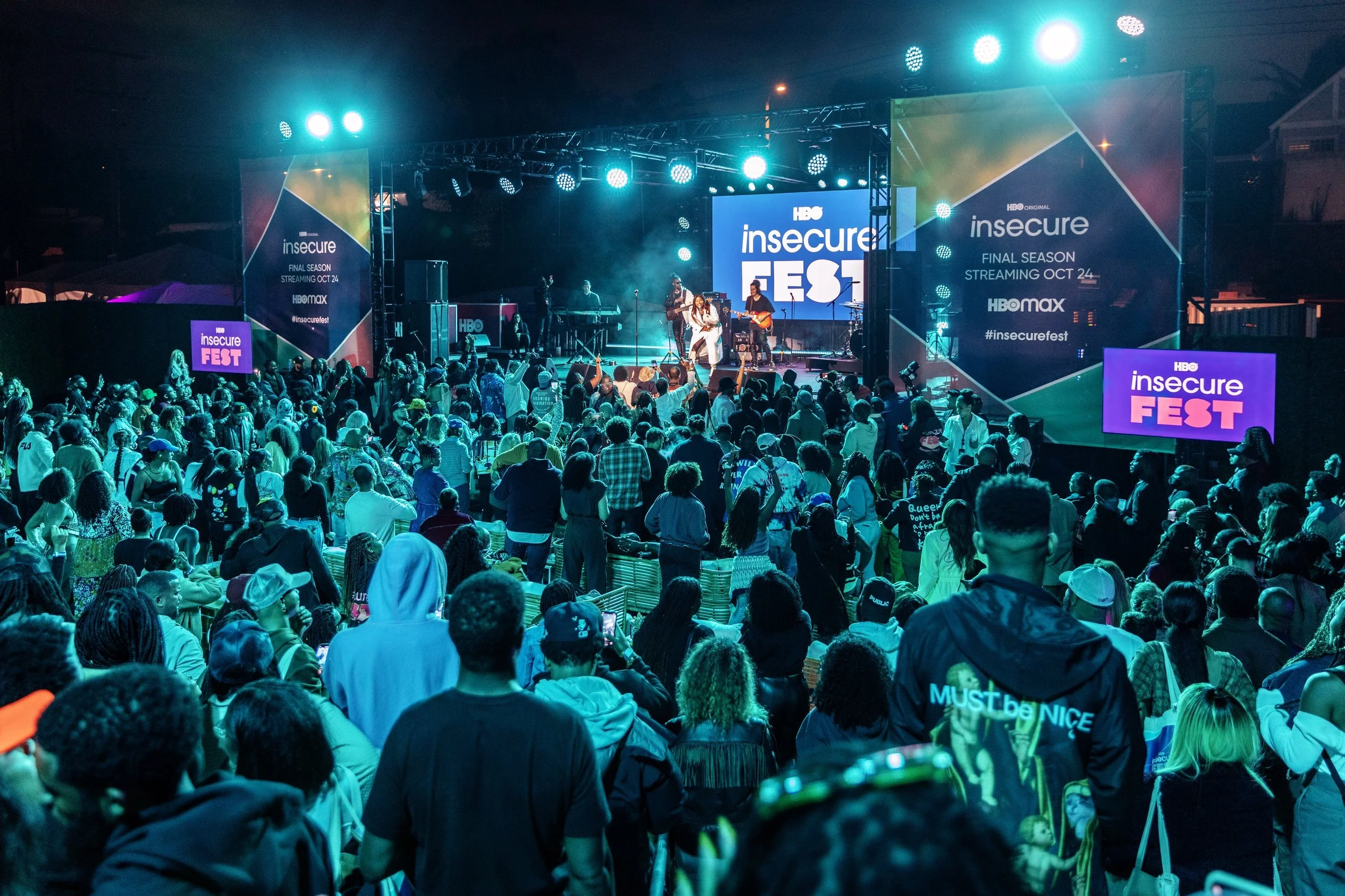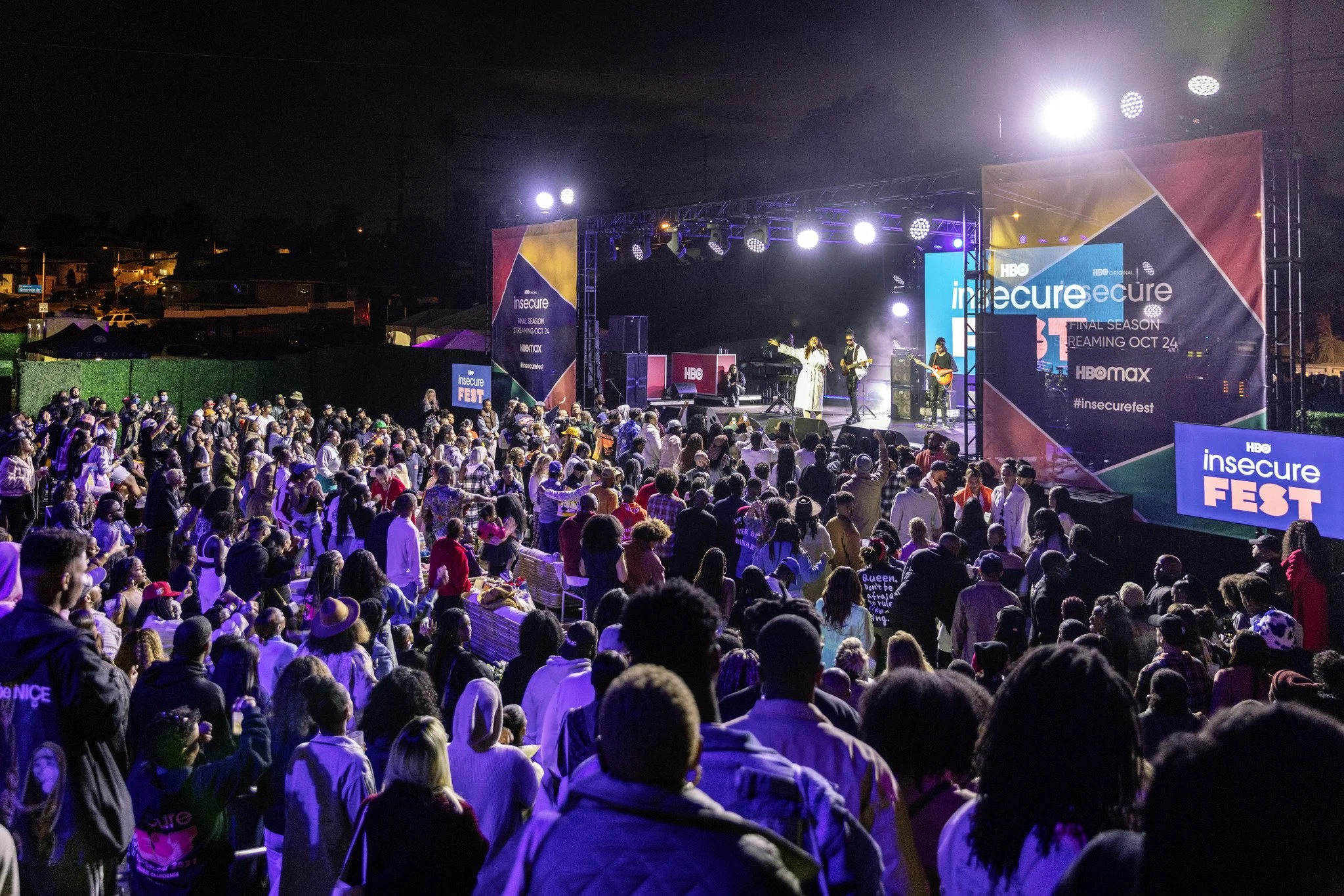 Context: To celebrate the premiere of the fifth season of the acclaimed HBO show Insecure, cast members and 600 specially-invited guests gathered in South Central Los Angeles for a blowout finale party known as InsecureFest. Fans were able to view an exclusive screening of Season 5 Episode 1, pose with recreated scenes from the show, sample local Black businesses in the marketplace and food vendors, and enjoy surprise musical performances by Jazmine Sullivan, Schoolboy Q, Duckwrth, Flo Milli and Kamaiyah.